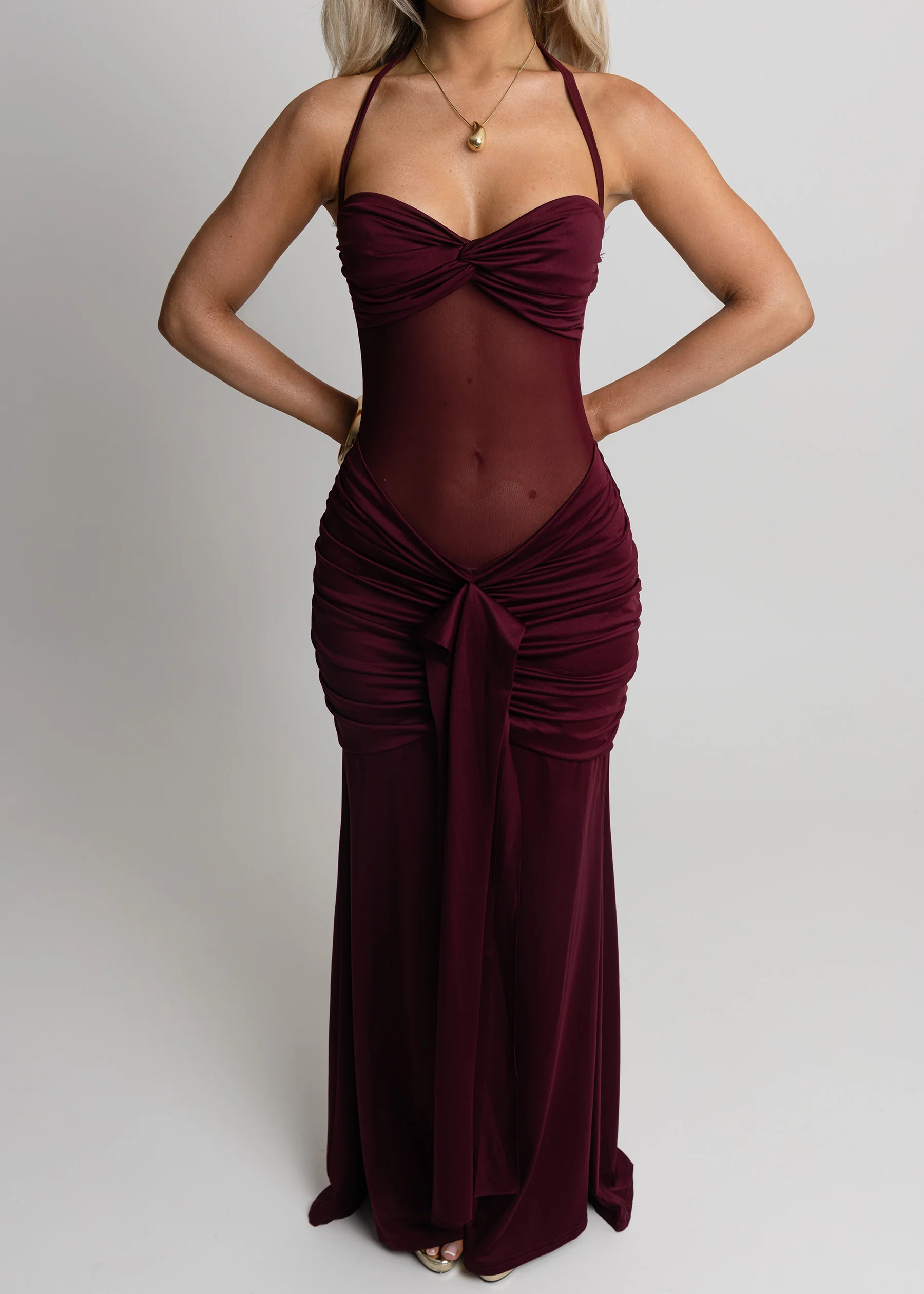 Turn every entrance into a moment with the Timeless Passion maxi dress. Designed to captivate, this striking silhouette features a sultry halter neckline with a twisted front detail that draws the eye. The softly sheer bodice adds an alluring touch, while artful ruching through the waist and hips creates a flattering, sculpted fit. Flowing effortlessly, the skirt moves with elegance and ease, making this dress perfect for evening events, formal occasions, or unforgettable nights out.
